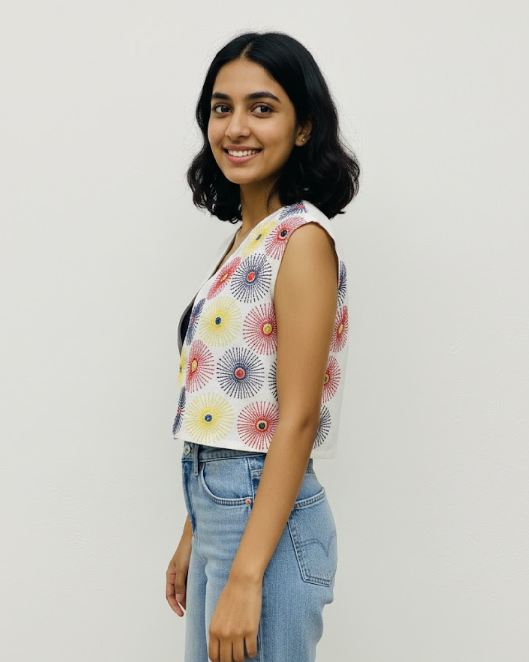 A sleeveless vest featuring hand embroidery in vibrant colors on an ivory base. The asymmetrical design and partial embroidery create visual interest, making it versatile for layering over kurtas, dresses, or tops across casual and festive settings.